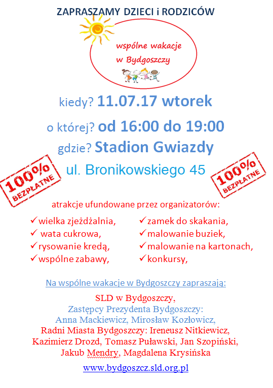 Wzorem ubiegłego roku samorządowcy lewicy w Bydgoszczy zapraszają na festyny rodzinne pod nazwą Wspólne wakacje. Na wszystkich uczestników czeka mnóstwo darmowych atrakcji. Pierwsze dwie imprezy plenerowe już w najbliższy wtorek i środę.