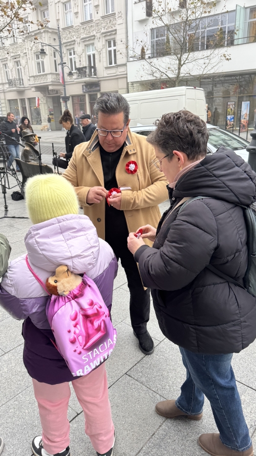 "Szanowni Państwo, jesteśmy dokładnie w przededniu rocznicy odzyskania przez Polskę niepodległości. Bardzo ważne święto, święto wszystkich obywateli, bez względu na to, czy są zwolennikami lewicy, prawicy, święto nas wszystkich. Dlatego dzisiaj z okazji tego święta będziemy rozdawać mieszkańcom Łodzi kotyliony, żeby jutro dumnie ten kotylion przyczepili sobie do kurtki, do marynarki, do swetra i dumnie pokazywali, że Polska jest niepodległym krajem". - mówił Tomasz Trela, Poseł Na Sejm RP.